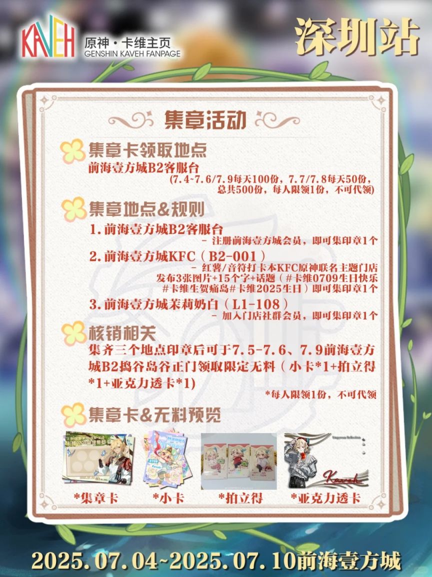 活动主题:深圳独家!原神卡维生贺痛岛! 活动时间:2025年7月4日-10日 活动具体地点:前海壹方城B2捣谷岛次元主题岛 活动内容: 1、大屏轮播&灯箱霸屏 2、多处精美打卡点 3、集章打卡联动KFC原神联名主题店、茉莉奶白应援痛店(集满3个章可以领取限定无料小卡*1+拍立得*1+亚克力透卡*1) 4、卡厨限定生贺无料