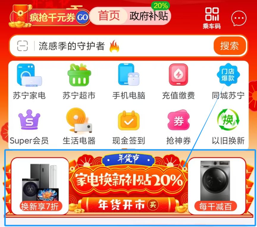第一步,下载并打开苏宁易购APP(还没下载的可以点此下载),点击首页的家电换新补贴20%图标,或点击左上角的“疯抢千元券 GO”;