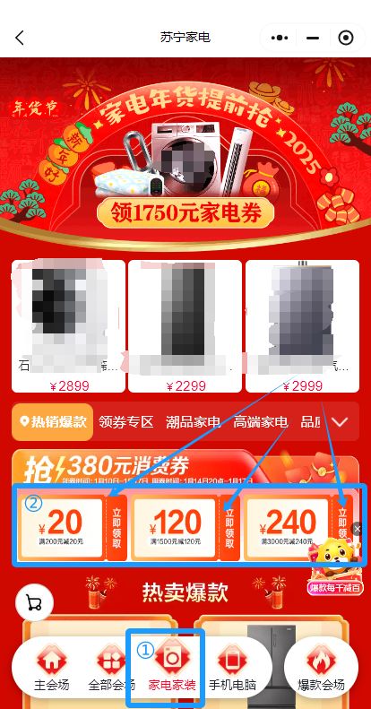 ### 3. 查找优惠券活动 - 在首页或者活动专区查找“家电家装优惠券”相关活动。 - 如果找不到,可以在搜索框中输入“家电家装优惠券”进行搜索。